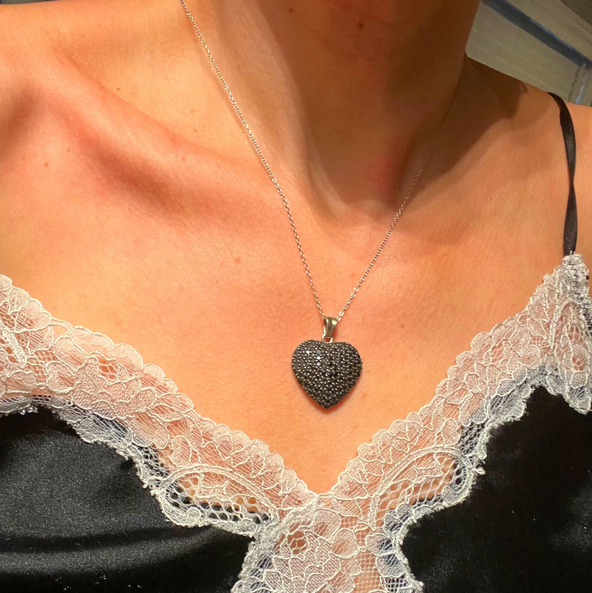 925 Sterling Silver heart pendant covered in black pave cz on 18-inch sterling silver chain