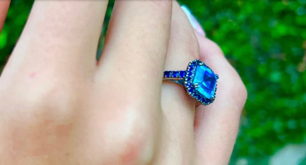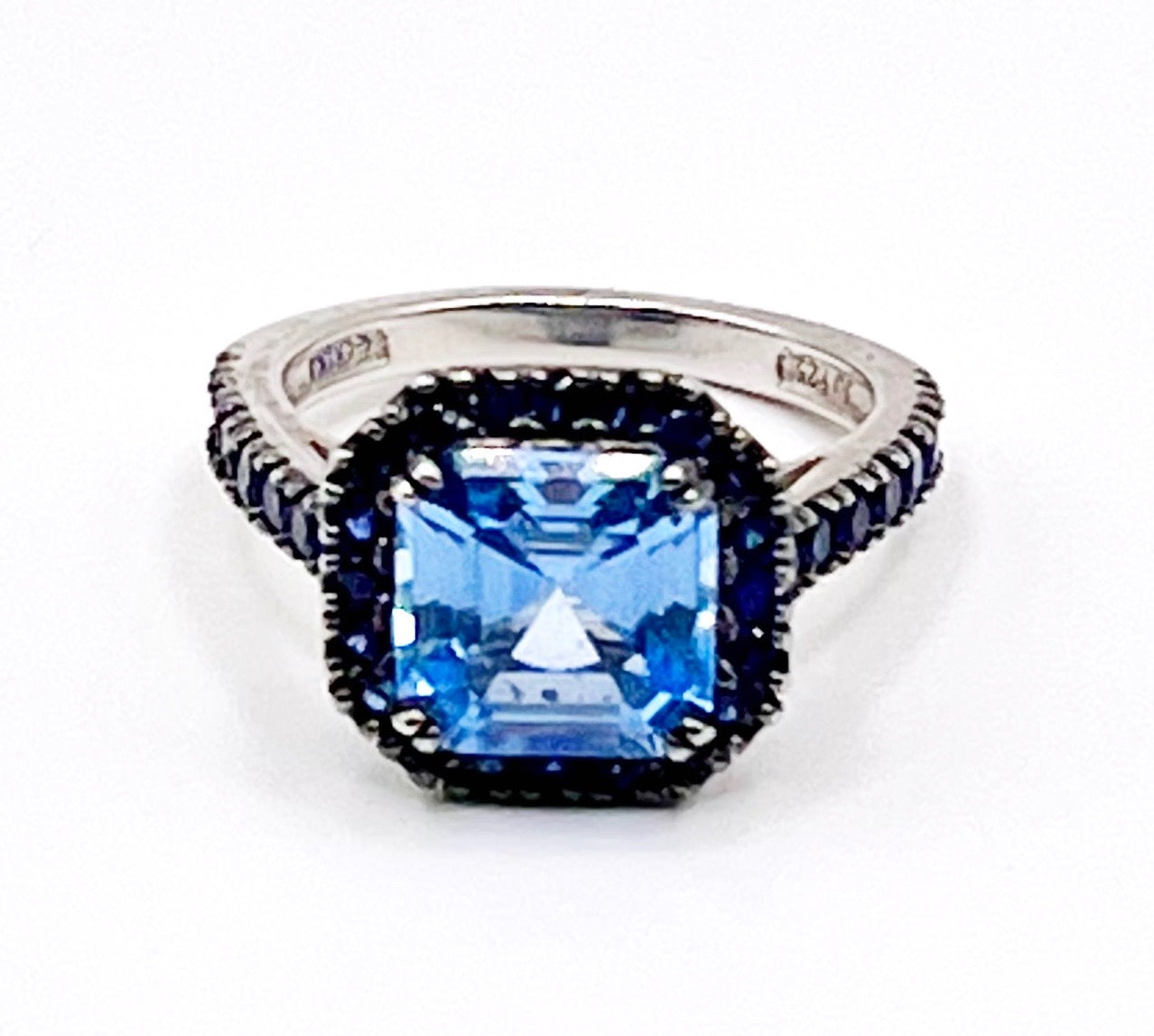 Gorgeous Square Cushion Cut Blue CZ 925 Sterling Silver Statement Ring with a blue CZ stone halo setting, Size 6, 2023.